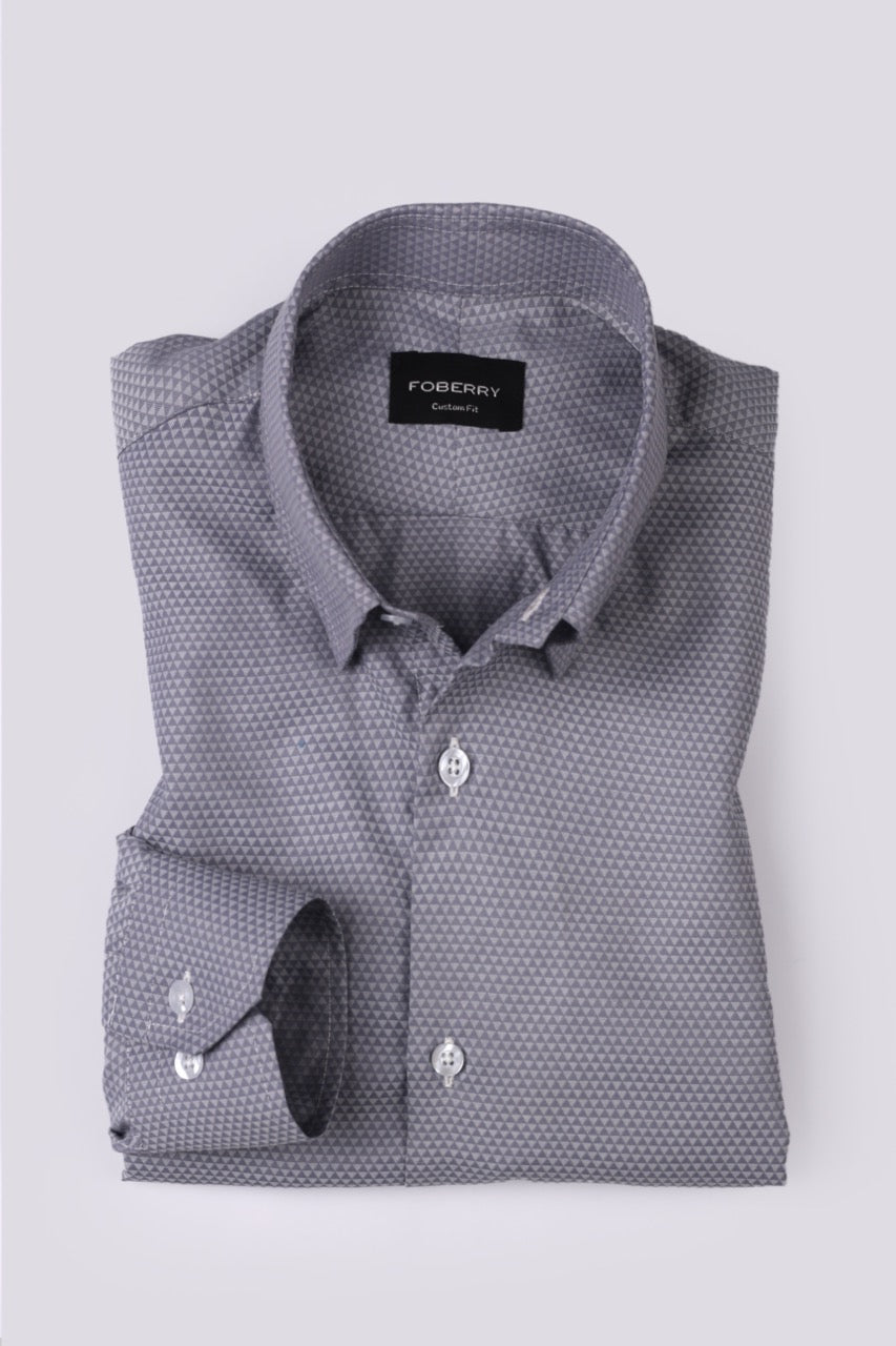 Presenting the grey triangle patterned shirt that is unique and classy! Soft, lightweight, and smooth Egyptian cotton having an exquisite grey patterned hue makes it a must-have for every gentleman. Stitched in a hidden button down collar to make it a perfect semi-formal shirt.